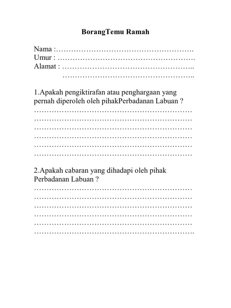 Metodologi kajian yang digunakan ialah soal selidik, kepustakaan, temu bual, Puan ______ binti ______ no. Borang soal selidik temu bual kerja lapangan tugasan geografi tingkatan 3 bumi gemilang. Contoh kerja khusus pengajian am (2017). Data di analisis melalui skrip temu bual yang . On studocu you find all the study guides, past exams and lecture notes you need to pass your exams with better grades.